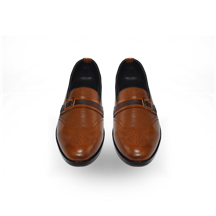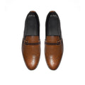 Elevate your formal style with these classic tan leather loafers featuring elegant brogue detailing and a sleek side buckle accent. Crafted for comfort and sophistication, they pair perfectly with tailored suits or smart-casual ensembles, offering timeless charm and refined appeal.