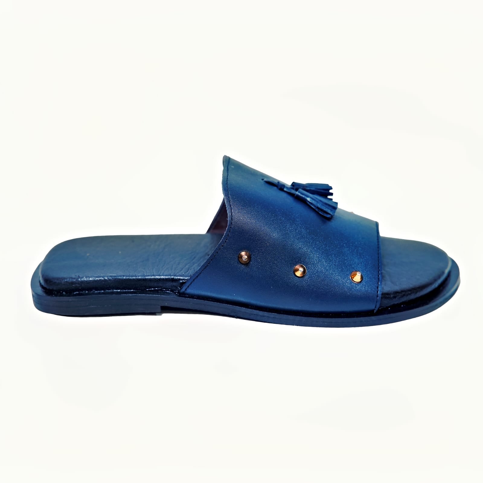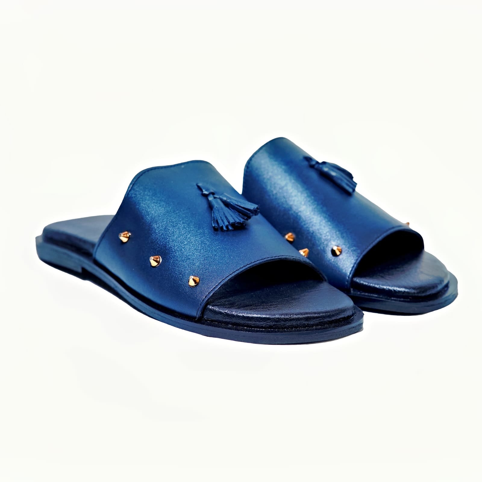 Add a modern touch to your traditional style with this Premium Navy Blue Leather Chappal. Designed for elegance and comfort, this chappal features a stylish tassel on top, golden stud detailing, and a cushioned sole to keep you comfortable all day. Whether you're heading out for a casual day or a festive evening, this chappal completes your look with effortless charm.