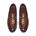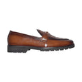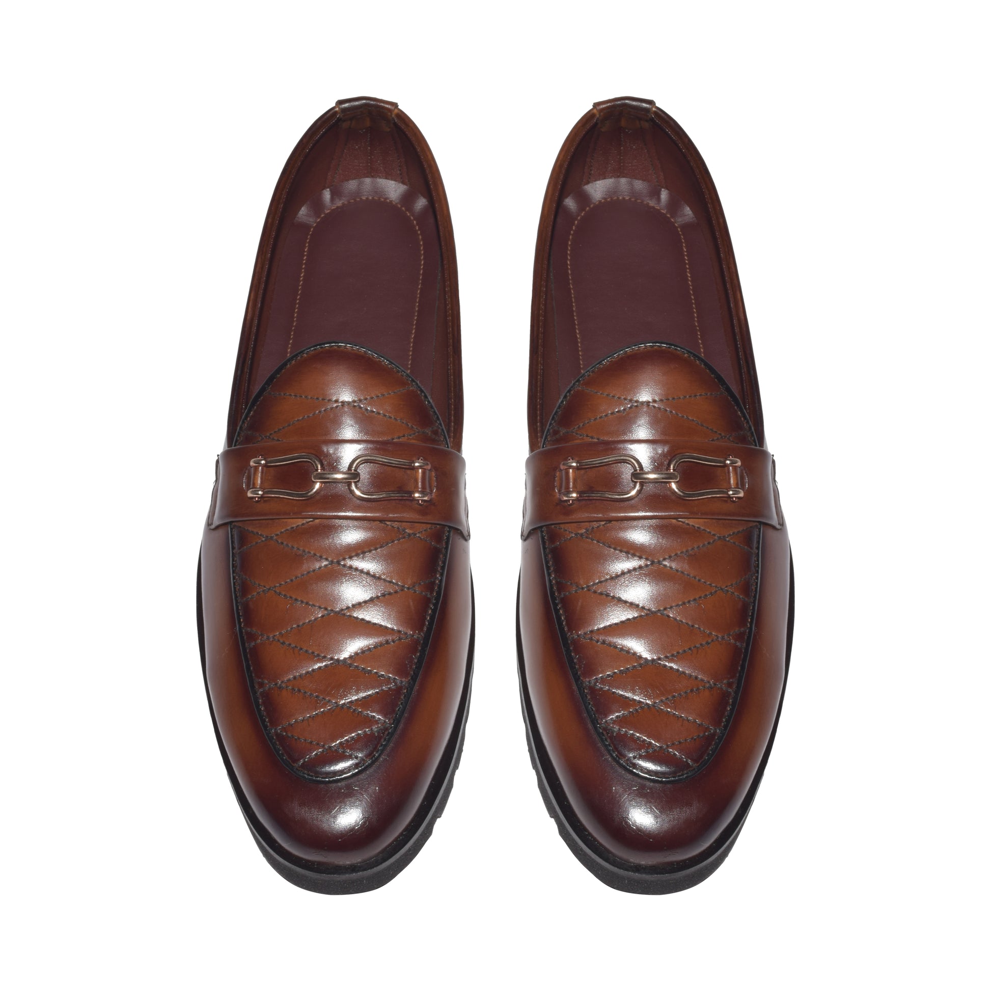 These contemporary tan loafers strike the perfect balance between sophistication and modern edge. Crafted from high-quality polished leather, they feature a sleek design accented by a decorative strap across the vamp with subtle metallic embellishments. The interior showcases quilted stitching for added comfort and a touch of luxury. Set on a durable black lug sole, these loafers provide excellent grip and a bold silhouette, making them ideal for both formal and semi-casual settings. Combining refined craftsmanship with a rugged foundation, they offer effortless style and versatility for the modern wardrobe.